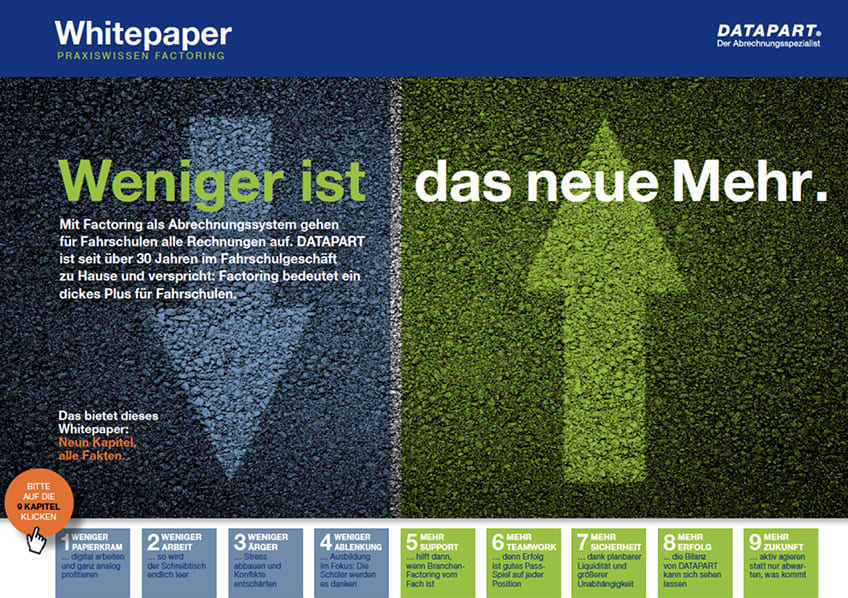 Neun Kapitel. Kurz und knackig. Alle Fakten zum Factoring für Fahrschulen. Aufbereitet von Journalisten des führenden Branchenmagazins „Die Fahrschule“. Das Whitepaper „Praxiswissen Factoring“ erklärt, wie es funktioniert: Mit weniger Aufwand mehr Erfolg erzielen.